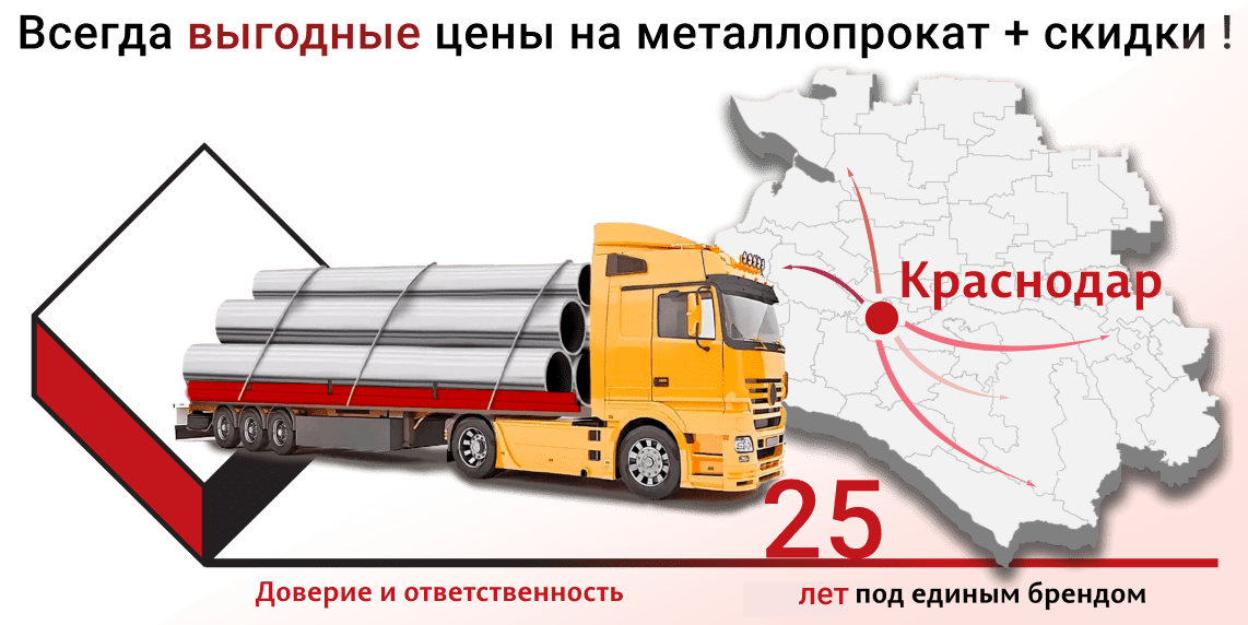 На рынок Краснодарского края компания вышла в начале 2021 года. Сейчас идет активная работа над расширением клиентской базы. Клиенты ценят в нас следующие качества: качественный сервис, широкий выбор позиции металлопроката, быструю доставку, гибкость и компетенцию менеджеров. В нашем распоряжении транспорт любой грузоподъемности (от 1,5 до 20 тонн), который доставит необходимый сортамент в кратчайшие сроки.